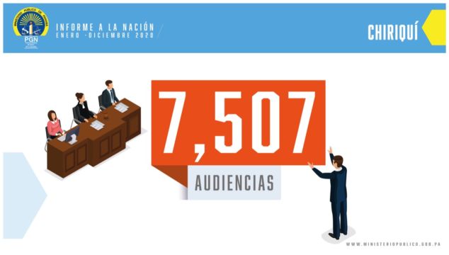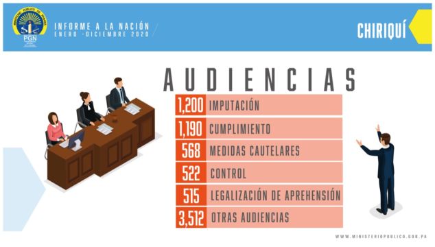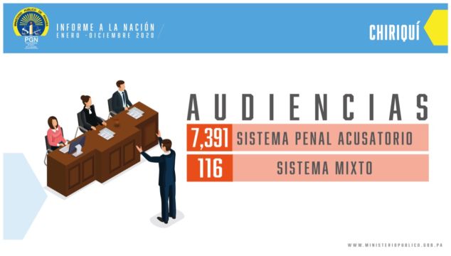 Se llevaron a cabo un total de 7,507 audiencias, entre las cuales 7,391 se dieron bajo el SPA y 116 correspondieron al sistema mixto inquisitivo. Entre las audiencias realizadas e el SPA 1,200 fueron de imputación de cargos; 1,190 audiencias de Cumplimiento, 568 de medidas cautelares y 522 audiencias de control previo y posterior, entre otras.