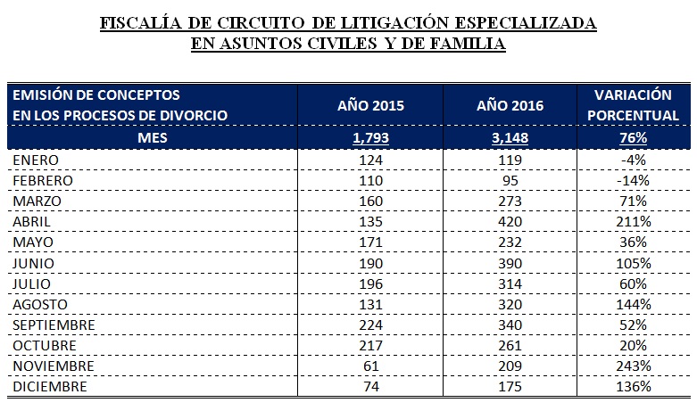 El mes de noviembre de 2016 representó un aumento de 243% en cuanto a las emisiones de concepto en procesos de divorcio en la Fiscalía de Circuito de Litigación Especializada en Asuntos Civiles y de Familia, según un informe estadístico de esta agencia del Ministerio Público.