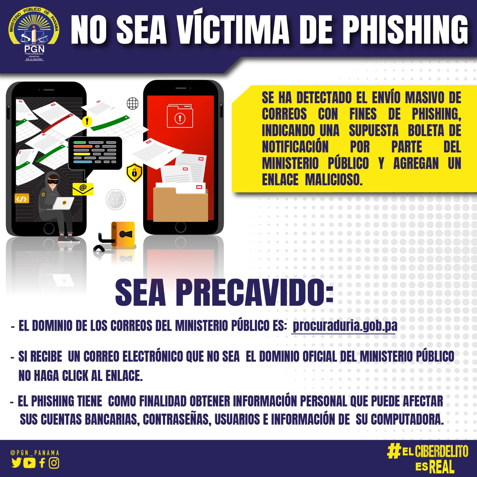 El Ministerio Público advierte a la ciudadanía que podría tratarse de la modalidad conocida como phishing, mediante la cual con correos falsos y enlaces maliciosos acceden a su información privada contenida en sus dispositivos para sustraer claves de cuentas bancarias, tarjetas de crédito y demás datos que podrían ponerlo en vulnerabilidad.