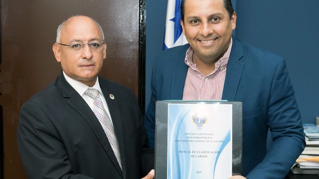 La Dirección de Recursos Humanos, a través del Coordinador de la Oficina de Apoyo a la Comisión de Carrera de la Procuraduría General de la Nación, Roberto Crespo Lezcano, hace entrega formal al Director General de Carrera Administrativa, Licenciado David Montenegro, el Manual de Clasificación de Cargos 2019, documento que contiene la actualización de la descripción de las Clases Ocupacionales de la Procuraduría General de la Nación, que servirá para la clasificación de puestos y la adecuada administración del recurso humano.