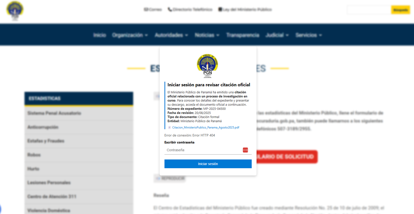 Una advertencia de la Dirección de Informática de la Procuraduría General de la Nación indicó que, personas inescrupulosas se han dado a la tarea de crear un sitio web fraudulento, intentando hacerse pasar por el Ministerio Público de Panamá, tratándose de la modalidad delictiva conocida como “phishing”, con el objetivo de engañar a los usuarios y obtener información sensible.
