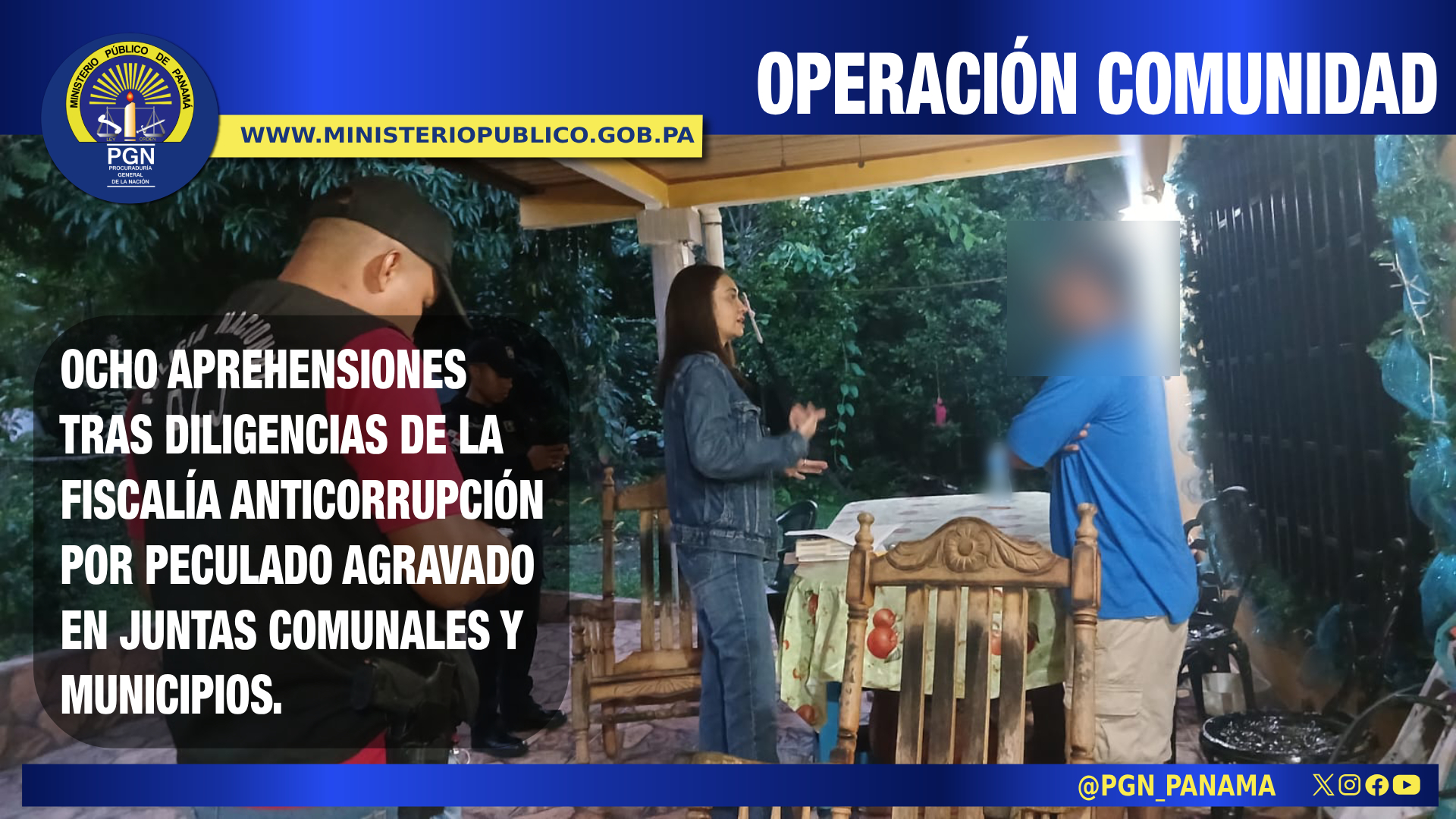 La Procuraduría General de la Nación por medio de la Fiscalía Anticorrupción ejecutó a tempranas horas de este miércoles la Operación Comunidad, la cual dio como resultado ocho aprehensiones en las provincias de Veraguas y Chiriquí, como parte de las investigaciones por el presunto uso indebido de fondos públicos provenientes del Programa de Interés Social (PDIS), en perjuicio de distintas Juntas Comunales y Municipios a nivel nacional, correspondiente al periodo 2019-2024.