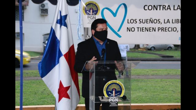 El Procurador General de la Nación, Eduardo Ulloa Miranda, junto a Dayra Campos, de la Comisión Contra la Trata de Personas del Ministerio de Seguridad y Lourdes Gutiérrez de la Oficina de las Naciones Unidas Contra la Droga y el Delito (UNODC), realizó el encendido de luces del edificio sede de la Procuraduría General de la Nación, como acto simbólico que da inicio a las actividades que desarrolla el Ministerio Público (MP) en septiembre, mes de la campaña “Corazón Azul contra la Explotación Sexual y Trata de Personas”.