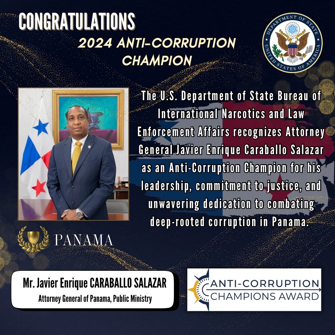 El Procurador Javier Enrique Caraballo Salazar, resaltó que “recibe este reconocimiento en nombre de todos los Fiscales e investigadores que luchan en Panamá contra la delincuencia y la corrupción”. Además, manifestó su agradecimiento a la Embajada de los Estados Unidos en Panamá que, a través de la Oficina de Asuntos Antinarcóticos y Aplicación de la Ley (INL) presentó su postulación para este reconocimiento a nivel internacional.