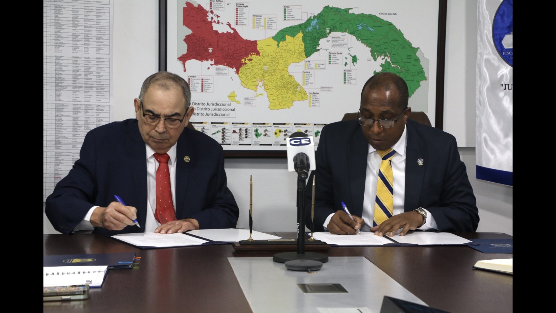 El Procurador General de la Nación Javier Enrique Caraballo Salazar y el Fiscal General Electoral, Dilio Arcia Torres, firmaron un convenio relacionado a la atención de los posibles delitos que se puedan dar durante las elecciones del 5 de mayo de 2024.