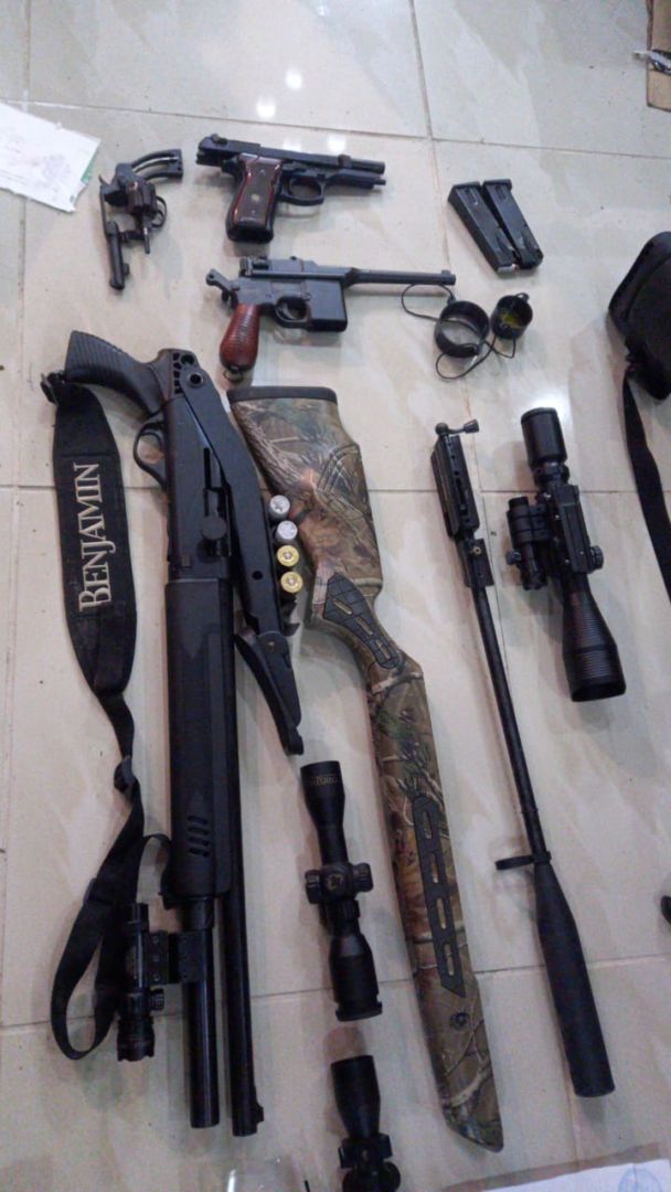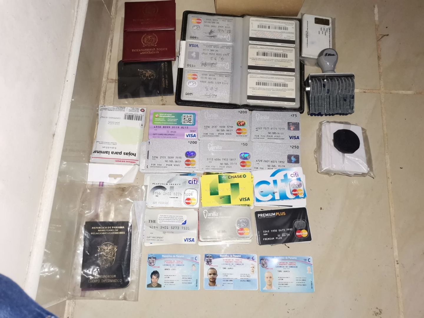 Esta diligencia se realizó hoy, 11 de marzo de 2022, en la comunidad de Cerro Azul, corregimiento de 24 de Diciembre, donde se dio con el decomiso de armas de fuego, una de ellas sin permiso, gran cantidad de municiones, pasaportes, sellos, máquinas para establecer fechas, tarjetas de crédito y débito supuestamente clonadas, tarjetas con chip incrustado, computadoras, impresoras, licencias de conducir posiblemente falsas, tarjetas plásticas con la inscripción de otro país, máquinas de metal utilizadas para la falsificación de tarjetas, documentación concerniente a numeraciones y supuestas identificaciones de cuerpo diplomático.