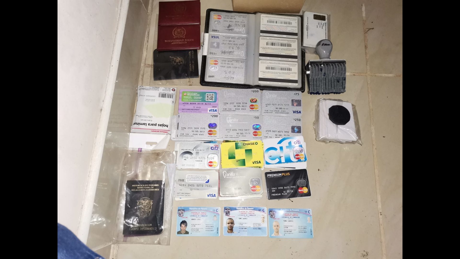 Esta diligencia se realizó hoy, 11 de marzo de 2022, en la comunidad de Cerro Azul, corregimiento de 24 de Diciembre, donde se dio con el decomiso de armas de fuego, una de ellas sin permiso, gran cantidad de municiones, pasaportes, sellos, máquinas para establecer fechas, tarjetas de crédito y débito supuestamente clonadas, tarjetas con chip incrustado, computadoras, impresoras, licencias de conducir posiblemente falsas, tarjetas plásticas con la inscripción de otro país, máquinas de metal utilizadas para la falsificación de tarjetas, documentación concerniente a numeraciones y supuestas identificaciones de cuerpo diplomático.