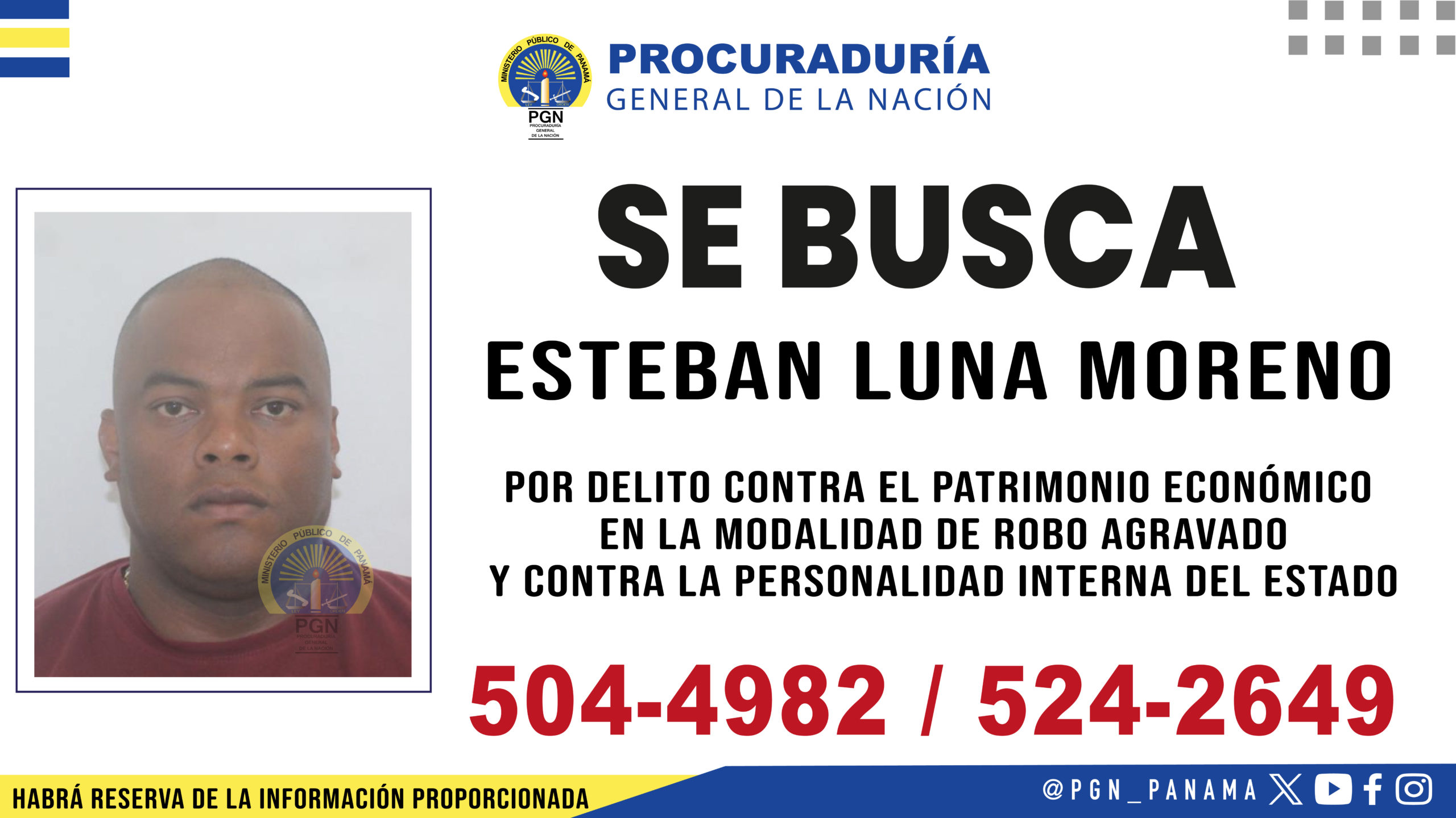La Procuraduría General de la Nación, a través de la Sección Cuarta de Delitos contra el Patrimonio Económico de la Fiscalía Metropolitana, solicita la colaboración de la ciudadanía para dar con el paradero de Esteban Luna Moreno, con cédula de identidad personal No. 8-802-400, investigado por la presunta comisión del delito contra el patrimonio económico, en la modalidad de robo agravado y delitos contra la personalidad interna del Estado.