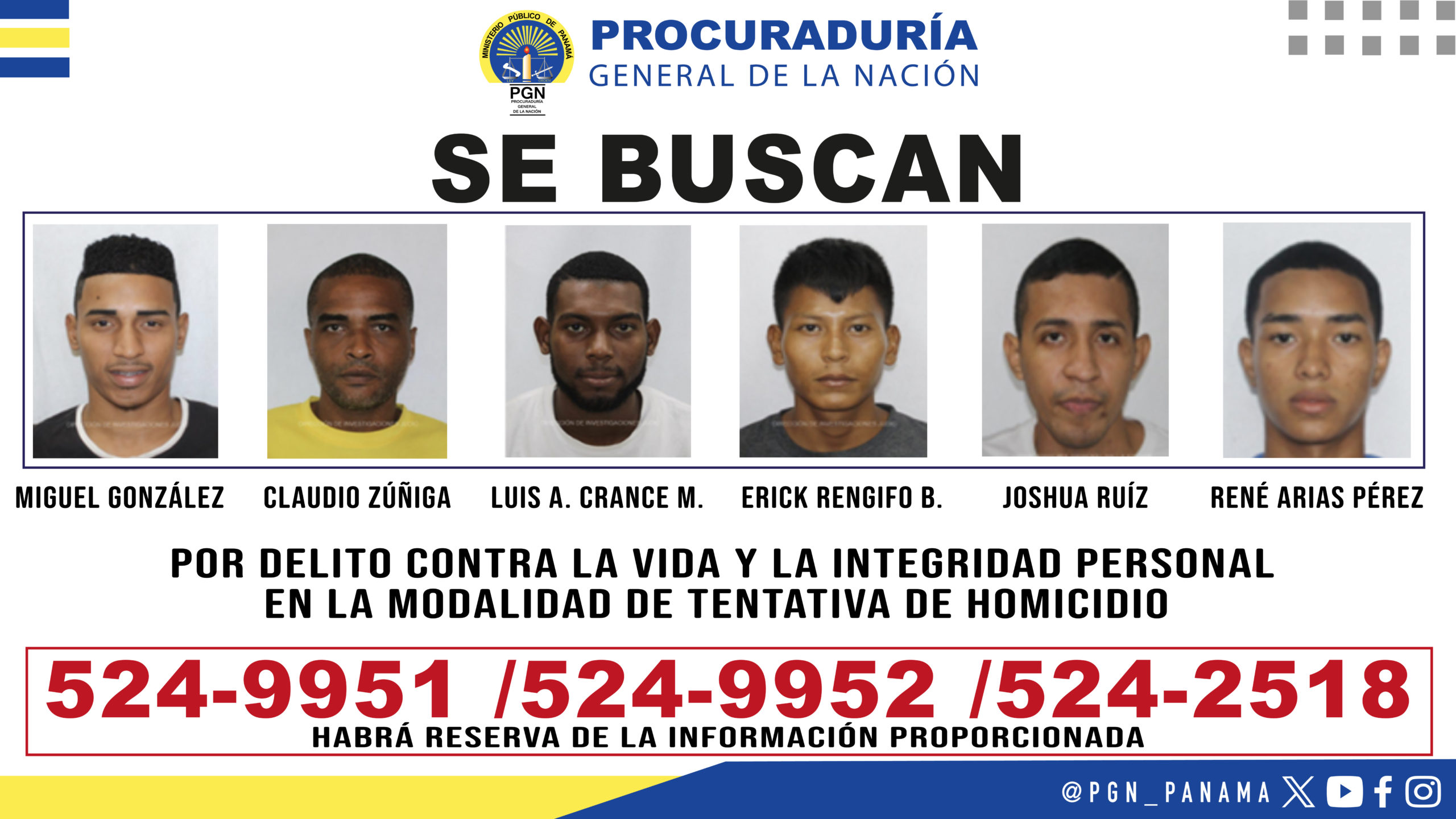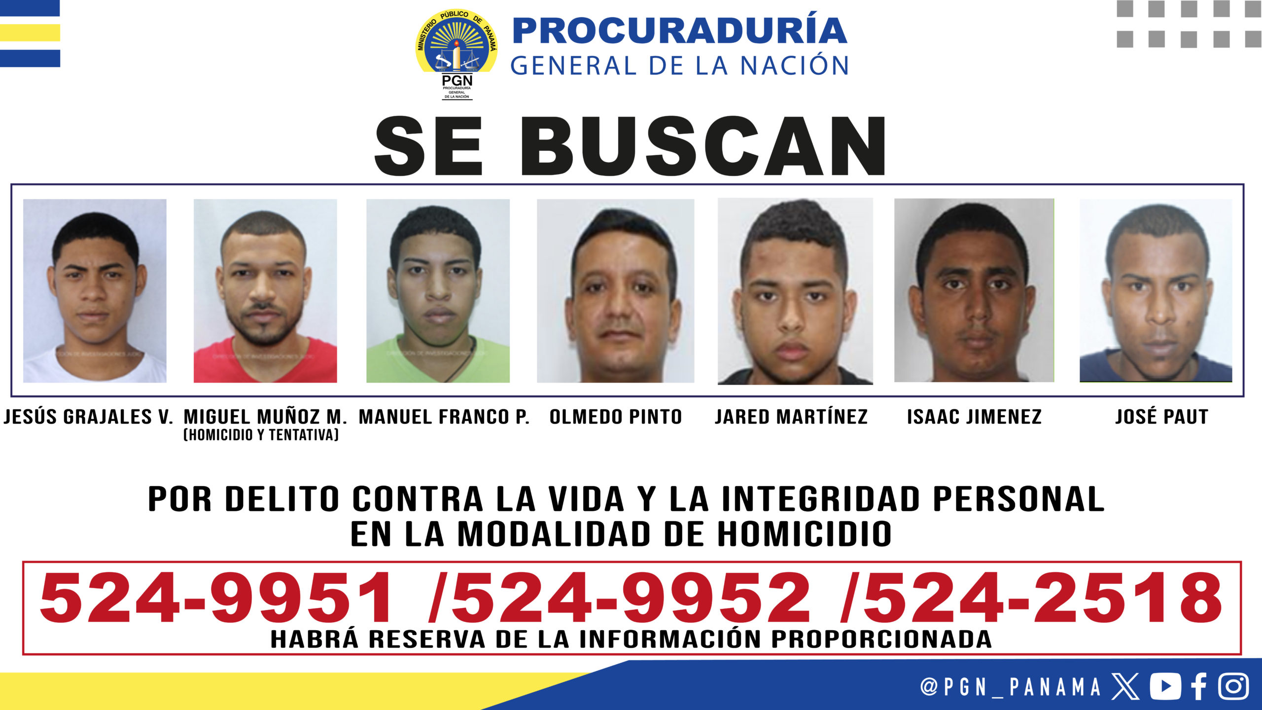 De tener conocimiento sobre la ubicación de alguna de estas personas por favor comunicarse a los teléfonos 524-9951 / 524-9952 de la Sección de Homicidio y Femicidio o al 524-2518 de la División de Delitos contra la Vida y la Integridad Personal de la Dirección de Investigación Judicial de Panamá. Habrá reserva de la información proporcionada.