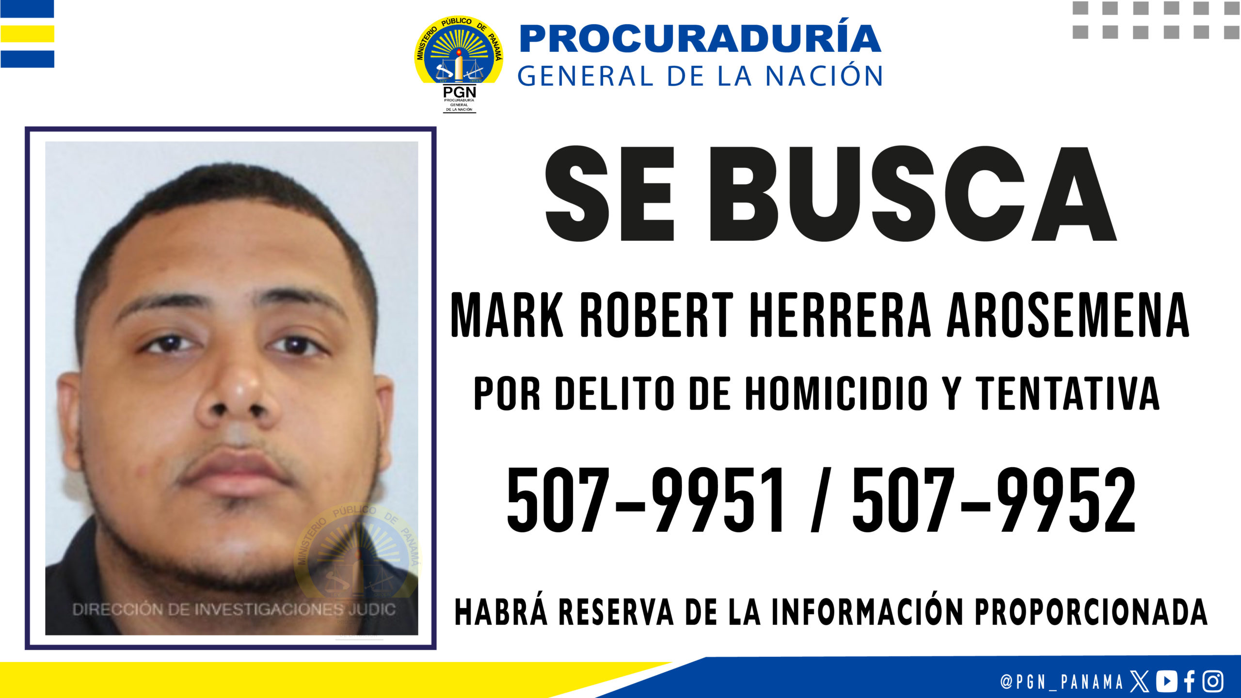 Se le anuncia a la comunidad que se solicita la colaboración para dar con el paradero de Mark Robert Herrera Arosemena, el cual es requerido con orden de aprehensión dentro de la investigación que adelanta la Sección Especializada en Homicidio y Femicidio de la Fiscalía Metropolitana, por la comisión de delito contra la vida y la integridad personal, homicidio doloso, en perjuicio de Leonel Edgardo Rivas Cunningham y Gerardino Vergara, y por homicidio en grado de tentativa en perjuicio de Ana Cecilia Vergara Rosado.