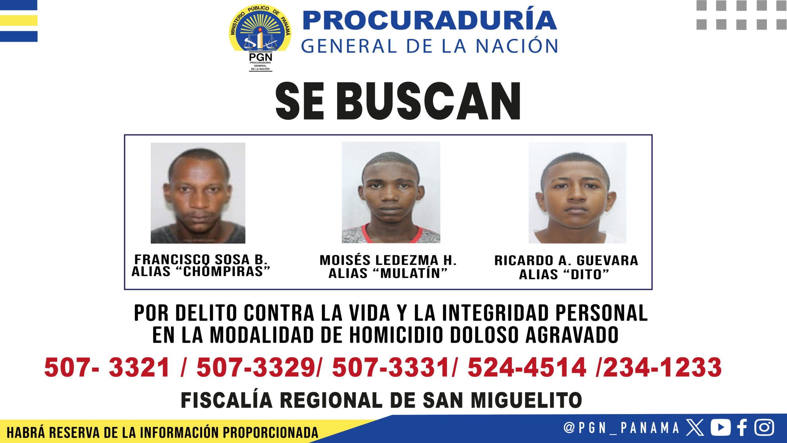 Se le anuncia a la ciudadanía que la Fiscalía Regional de San Miguelito, a través de la Sección de Homicidios y Femicidios, requiere de su colaboración para dar con el paradero de tres ciudadanos presuntamente vinculados a la comisión de delitos contra la vida e integridad personal, en la modalidad de homicidio doloso agravado.