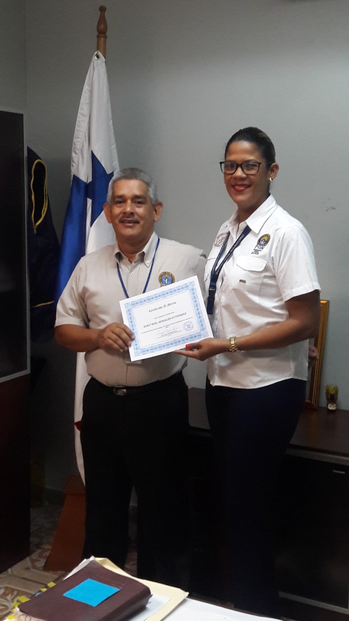La licenciada Roxana Terrero, Fiscal Superior de Chiriquí, le entregó certificado al mérito, al señor Rory Noel Morales, Asistente Ejecutivo de la Sección de Investigación y Seguimiento de Causas de Chiriquí; por su activa colaboración en el Karaoke realizado.