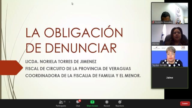 Como expositora estuvo la Fiscal de Circuito y Coordinadora de la Fiscalía de Familia y el Menor de Veraguas, Noriela Torres de Jiménez, quien orientó a los docentes sobre las diferentes formas de presentar una denuncia y la responsabilidad que tenemos todos los ciudadanos de denunciar ante las autoridades competentes, una vez se tenga conocimiento de un hecho de esta índole, donde sean víctimas niños, niñas y adolescentes.