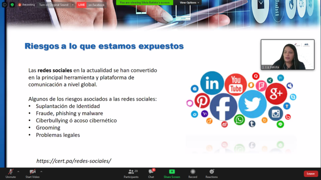 La Ingeniera Silvia Batista de la Autoridad Nacional para la Innovación Gubernamental (AIG), desarrolló el tema sobre los Riesgos en internet que están expuestos los niños, niñas y adolescentes, sus contenidos inapropiados, control parental y la importancia de concientizar a los padres sobre el uso de estas herramientas.