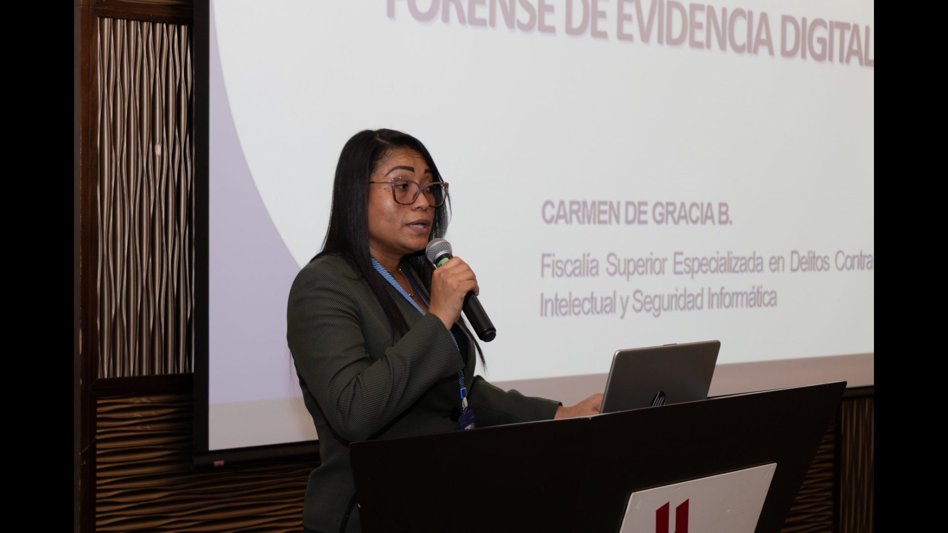 Entre los expositores estuvo la licenciada, Carmen de Gracia, Fiscal Superior Especializada en Delitos contra la Propiedad Intelectual, quien habló sobre la Contextualización de la realidad nacional del manejo forense de la evidencia digital, destacando el significado de la evidencia y la evidencia digital.