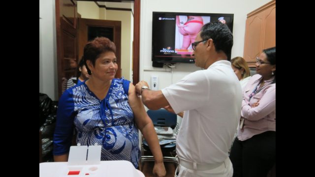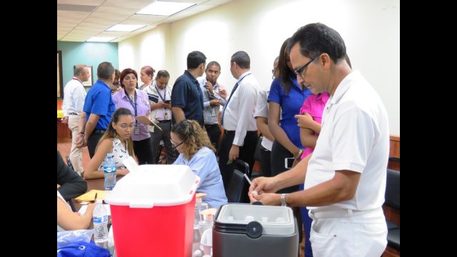 En la actividad realizada en el edificio Saloon fueron atendidos 99 funcionarios para vacunación de influenza, neumococo y toxoide. Adicional se hizo toma de presión, medición de los niveles de glucosa e índice de masa corporal, lo anterior se realiza en cumplimiento del plan estratégico de la Dirección de Recursos Humanos, específicamente del objetivo estratégico de generar conductas de solidaridad institucional, implementando programas de salud para el personal a nivel nacional.