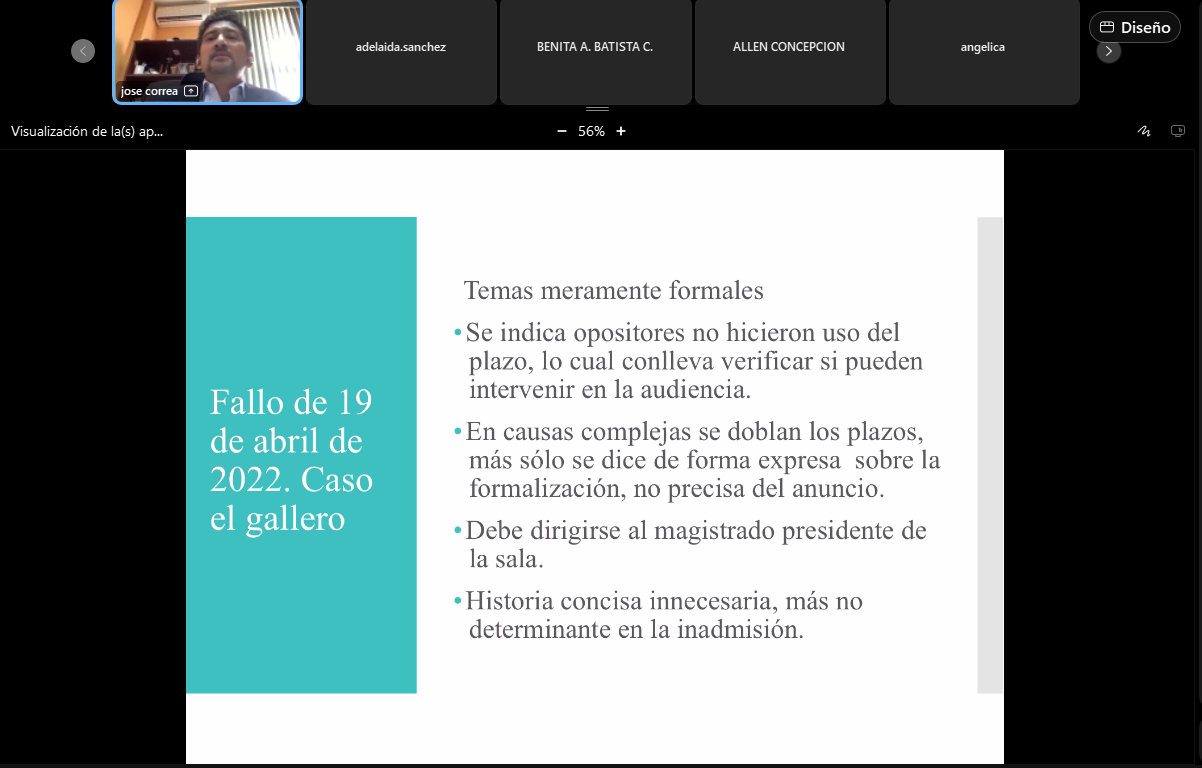 Correspondió en complemento a esta actividad a José Israel Correa García, Magistrado del Tribunal Superior de Apelaciones del tercer Distrito Judicial de la provincia de Chiriquí quien inició su intervención realizando docencia sobre el origen de este recurso, así como los objetivos del mismo y de fallos relevantes de la sala penal en temas de admisibilidad y fondo en casación. Se desarrollaron además temas como la forma, admisibilidad, las causales de la inadmisión, el procedimiento entre otros.